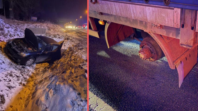 Z ciężarówki urwały się koła i wbiły się w osobówkę. Kierowca ratował się ucieczką do rowu