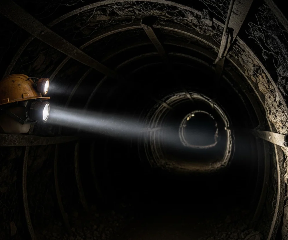 Autor: Redakcja Informacyjna AI/ Wygenerowane przez AIPo lewej stronie kadru widoczny jest żółty kask ochronny z dwoma świecącymi lampami, jedna na czole kasku, druga poniżej, obie emitują intensywne białe snopy światła. Kask jest matowy i porysowany, a z jego tyłu wychodzi ciemny kabel. Światło z lamp rzuca długie, rozświetlające pasma w głąb ciemnego, cylindrycznego tunelu, którego ściany pokryte są ciemną, nieregularną teksturą i wsparte metalowymi, łukowatymi podporami. W oddali tunel zwęża się, zarysowując kolejny, mniejszy łuk, lekko rozświetlony u dołu.
