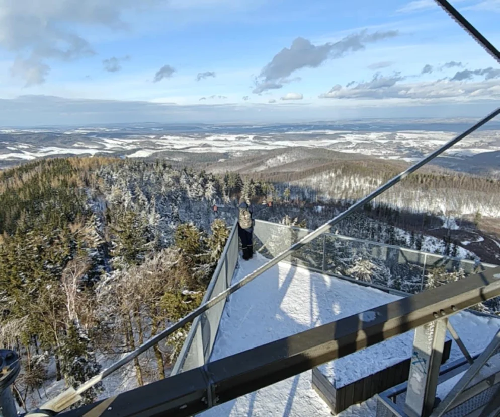 Zimą widok ze szczytu robi szczególne wrażenie. Białe Sudety, słońce odbijające się od śniegu i cisza, którą przerywa jedynie wiatr, tworzą niemal filmową scenerię.
